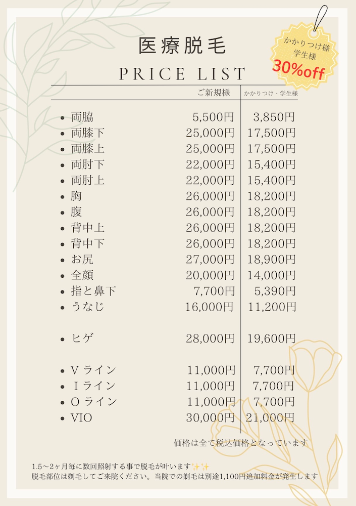 - 自己処理について: 治療予定日の前日または当日朝に、あらかじめシェーバーで剃毛を済ませてきてください。なお、剃り残しが多い場合は、別途料金の発生、または治療の延期をする場合がございます。