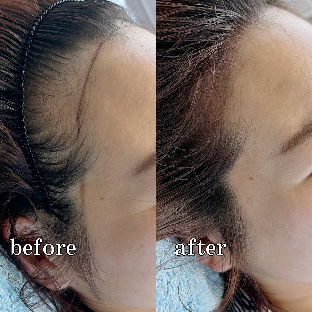 髪の毛(ヘア)に施すアートメイクは、薄毛が気になる生え際(ヘアライン)・つむじ・分け目部分をナチュラルな毛髪感に見せるための施術で、男女どちらからもご要望の声が多いです。またヘアラインの施術でおでこが狭く見えるようにしたり(小顔効果)、おでこの形の左右差を整えることもできます。詳しい内容等については、村中LINE公式アカウントにてお問い合わせください。